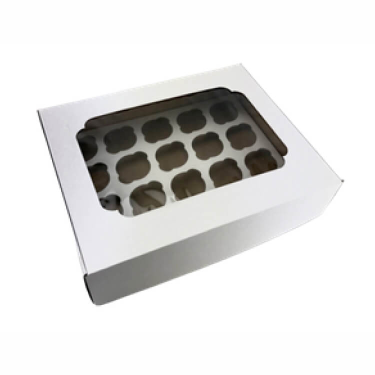Коробка для 20 капкейков размером 430*340*100 мм с обзорным окном сверху. Окно изготовлено из прозрачной ПЭТ пленки, через которую можно увидеть изделие, которое находится внутри коробки. Легкая и самосборная конструкция, состоящая из двух частей, коробки и ложемента, не потребует дополнительного скрепления, надежно защитит капкейки от внешних воздействий. Коробка внутри и снаружи белого цвета с ламинированным покрытием. Ложемент выполнен с удобными вырезами под каждый капкейк, что не позволит соприкасаться с соседними и со стенками коробки.