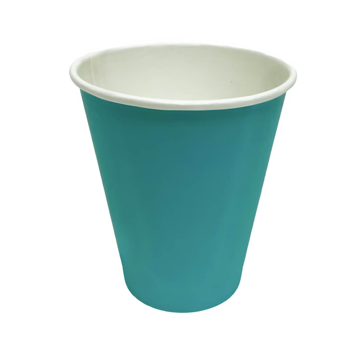 Бирюзовые одноразовые бумажные стаканчики для горячих напитков, изготовлены из однослойного картона, внешняя цветная печать. Объем стаканчиков — 250 миллилитров.